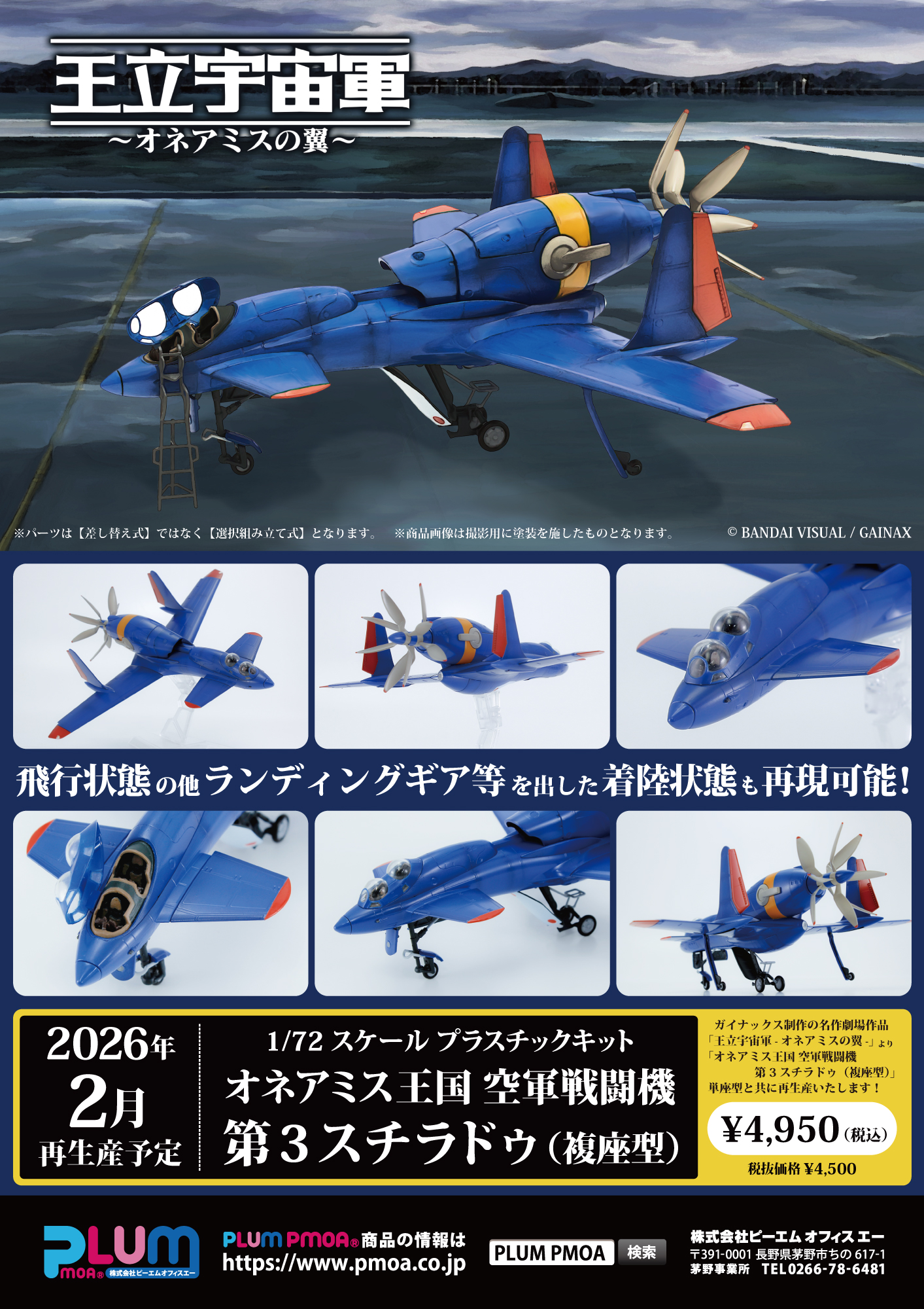 スペック 商品名:オネアミス王国 空軍戦闘機 第3スチラドゥ(複座型) スケール:1/72スケール 全長:約205mm 価格:4,950円(税抜価格 4,500円) 発売:2026年2月再生産予定 仕様:プラスチックキット |