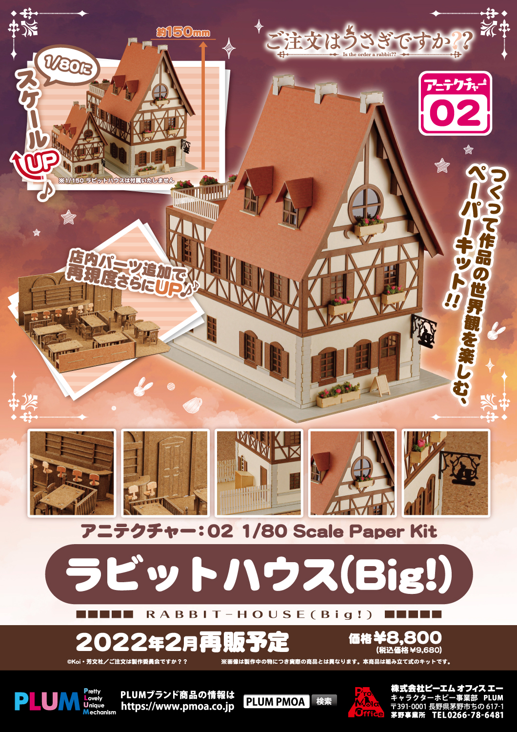 商品情報 商品名:1/80ペーパーキット ラビットハウス(Big!) スケール:1/80スケール 全高:約150mm 価格:9,680円(税抜価格 8,800円) 発売:2022年2月再生産 仕様:ペーパーキット |