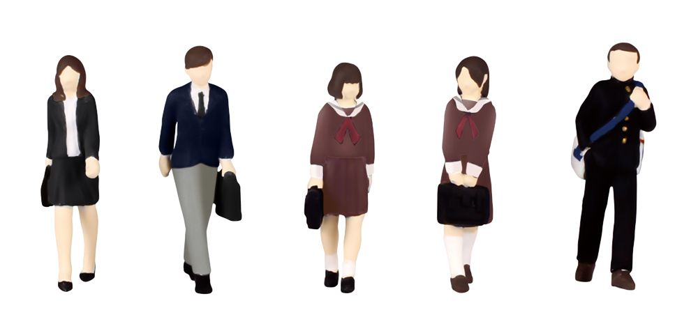 全員歩行ポーズで、男子高校生・女子高生・鞄両手持ち女子高生・男性会社員・女性会社員の5体で、急いでいたり楽しく会話している雰囲気を出しています。