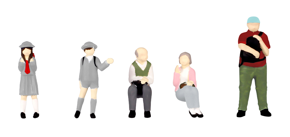 座りお年寄り男性・座りお年寄り女性・男子小学生・女子小学生・恰幅の良い男性の5体で、ランドセルなどの小物もしっかり造形しています。