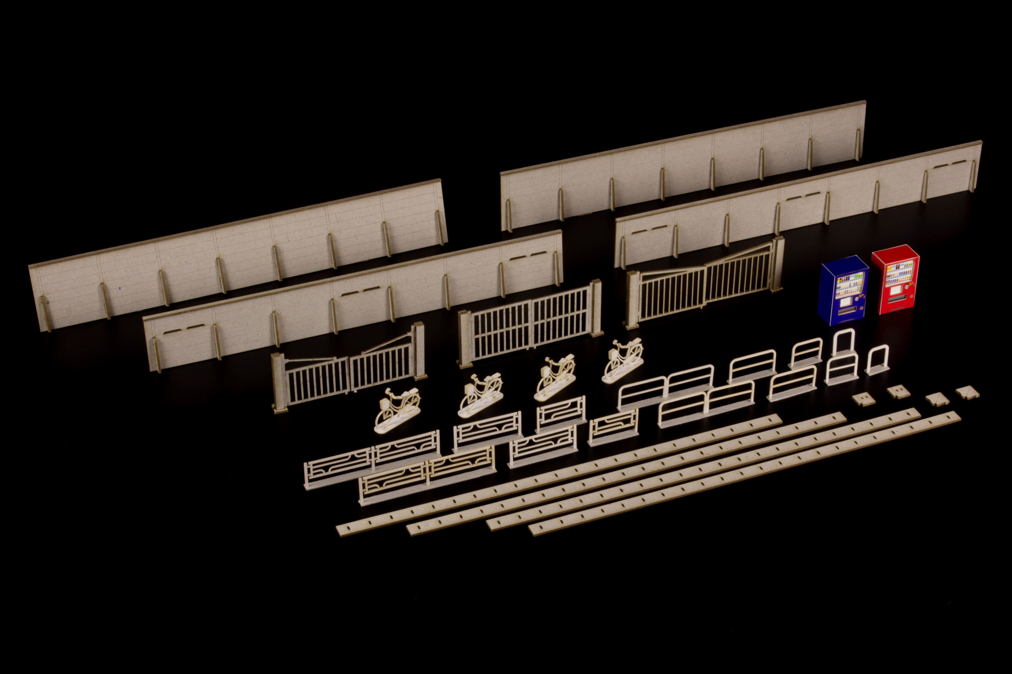 万年塀(2種)×各2、門(ゲート3種)×各1対、自動販売機×2、自転車×4、