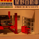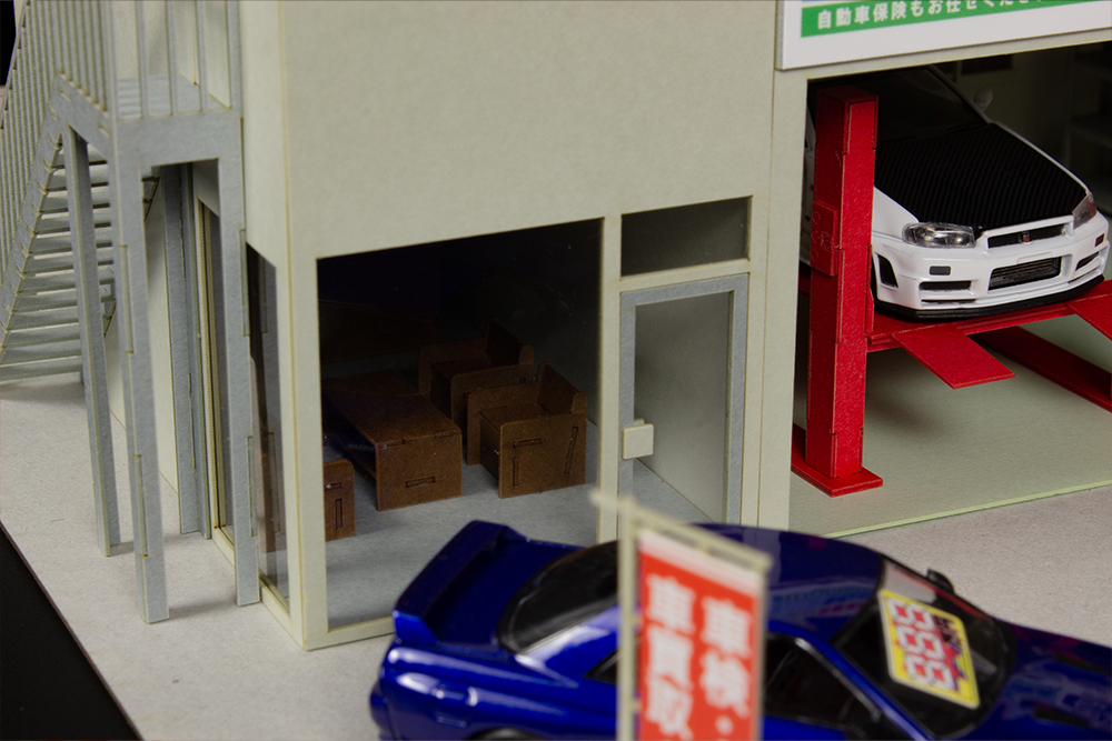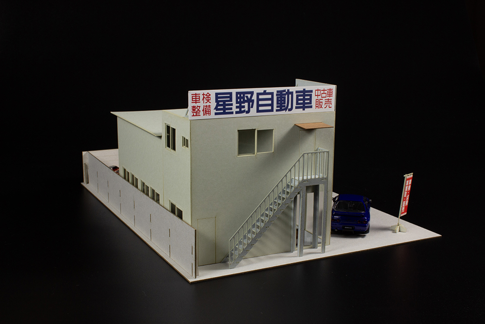 どこか懐かしい80年~90年代の自動車販売店の雰囲気をペーパーキットで立体化しました。